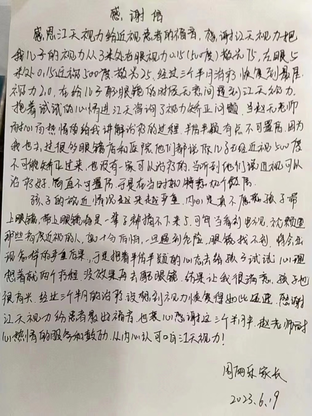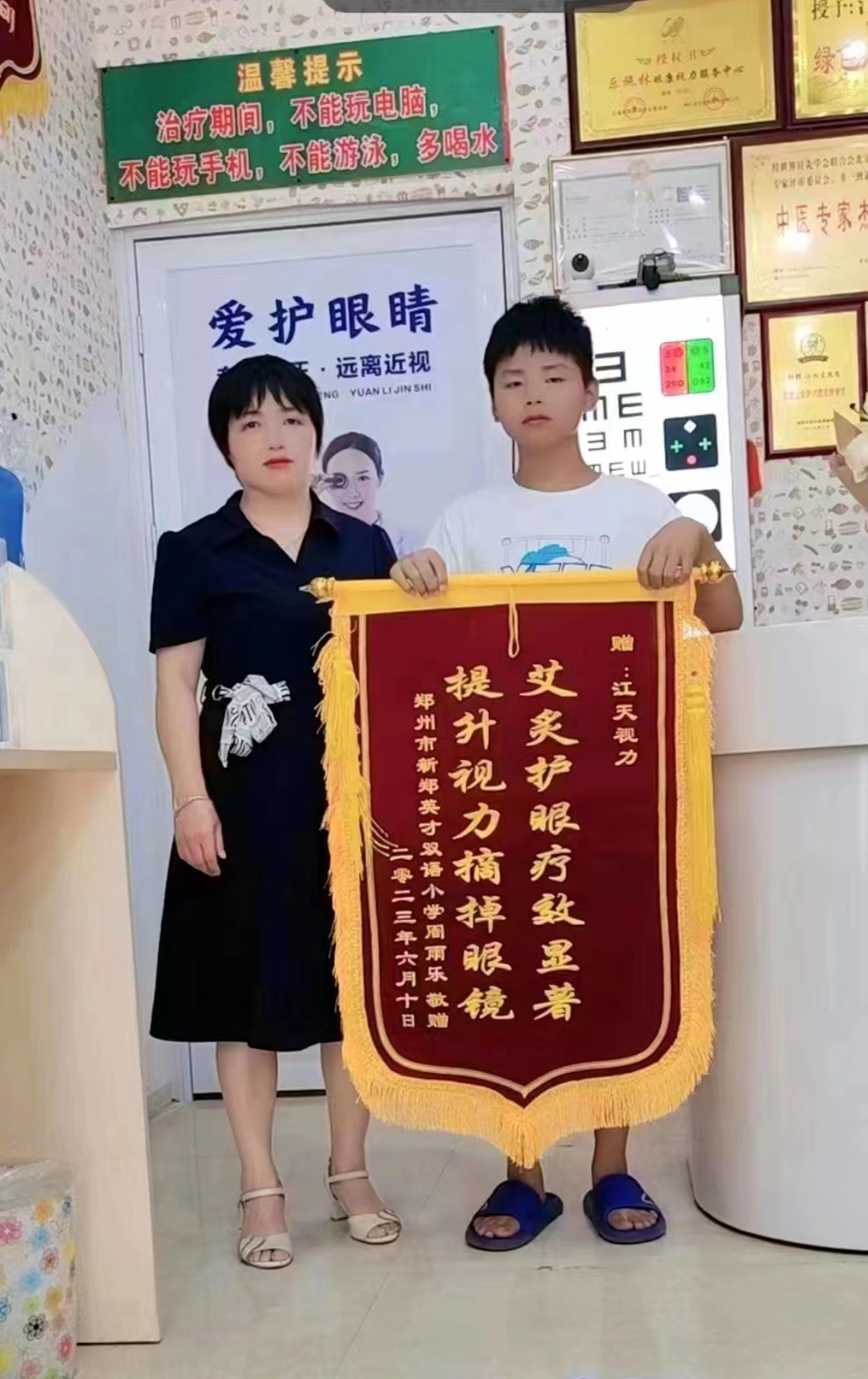 周雨乐的父母衷心感谢江天视力给近视患者带来的希望,感谢江天视力让他们的儿子的视力从近视500度恢复到了正常视力2.0。他们也感谢赵老师在这三个半月中,给他们提供了耐心、热情、专业的服务和鼓励。6月10日,他们与孩子一道,给郑州港区江天视力送了一面锦旗表达谢意。他们从内心认可江天视力,并且向身边的亲朋好友推荐江天视力。