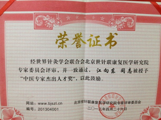 江大夫喜获“中医专家杰出人才奖”荣誉证书