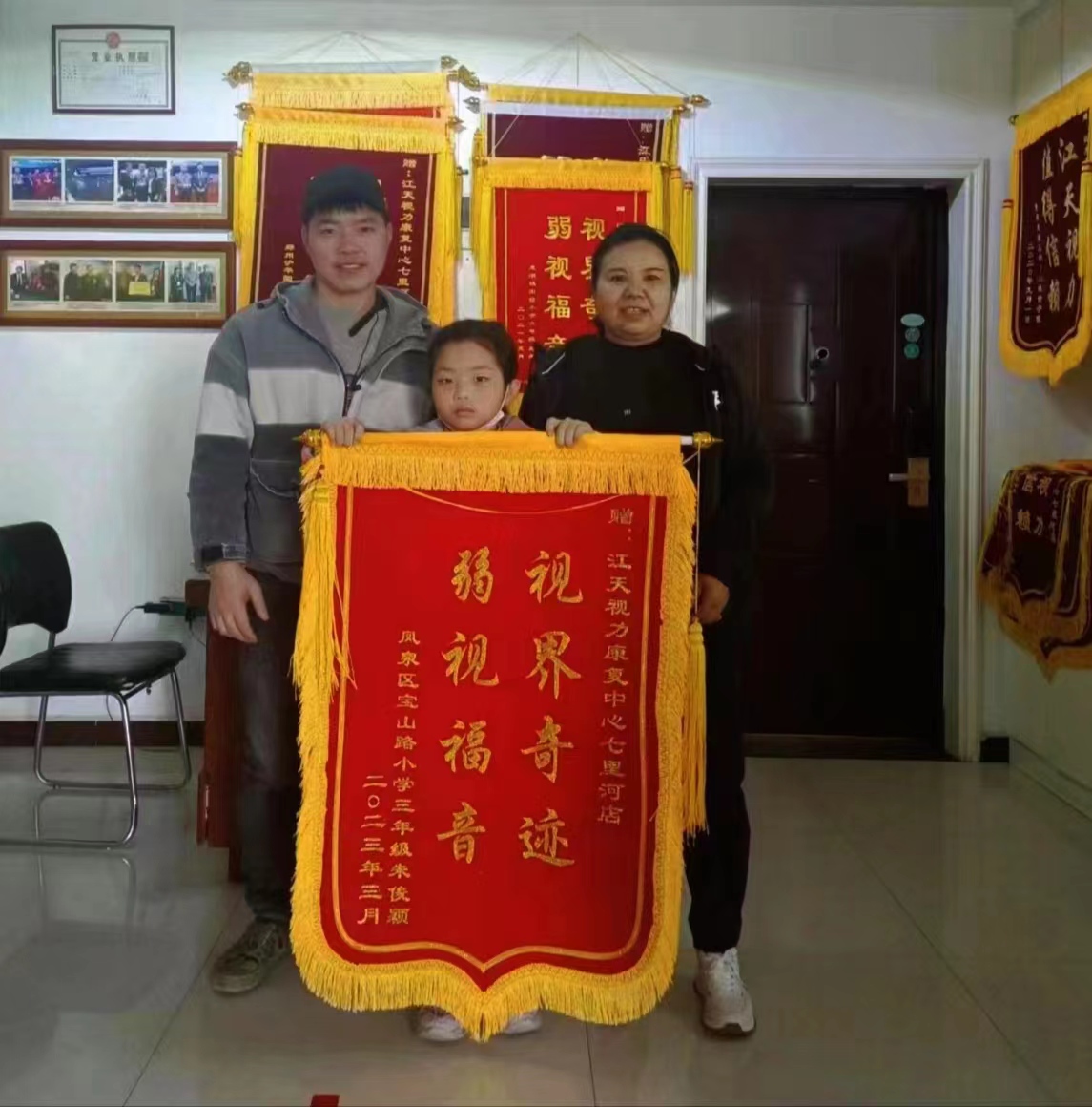 俊颖一家非常感激江天视力对他们的帮助,为此送上锦旗以表达谢意。他们表示,一定会宣传江天视力,希望更多的弱视、近视孩子能得到江天视力的帮助,恢复正常视力,摘掉眼镜。江天视力的工作人员告诉他们,要感谢就感谢中医,这些都是祖国传统医学带来的奇迹!
