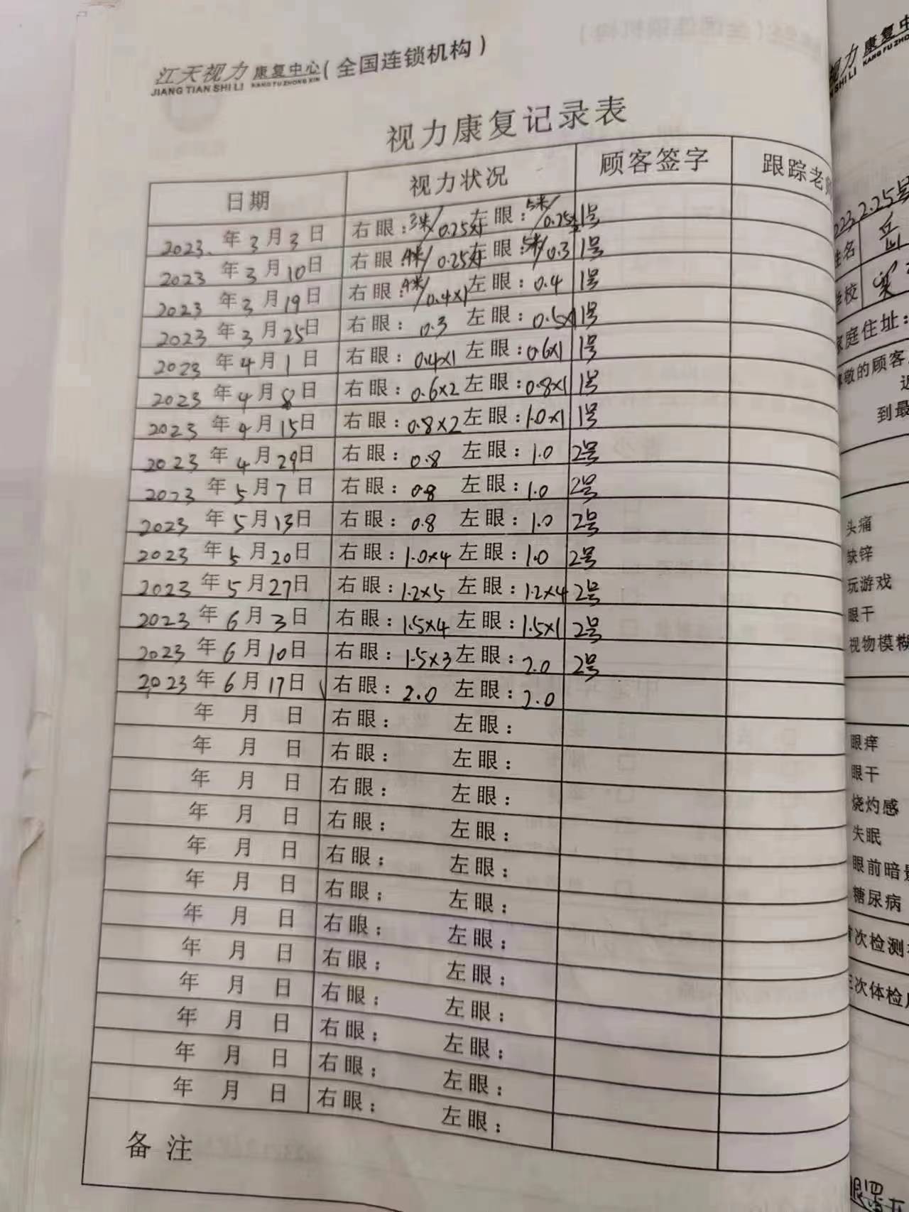 几个月后,还是没有更好的办法,在俊颖姑姑的一再催促下,2022年6月,他们抱着试试看的态度,从新乡开车来到了江天视力郑州七里河店。工作人员热情接待了他们,经过检查和详细的询问,建议先让俊颖体验一下,看看效果。经过一周的免费体验后,俊颖的视力提升了两行,双眼均从0.4提升至0.6!家长和孩子都感到非常惊喜,于是开始在江天视力接受矫正。